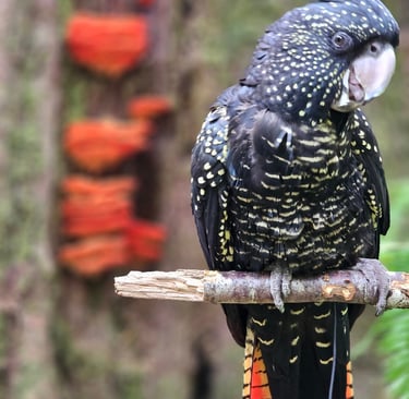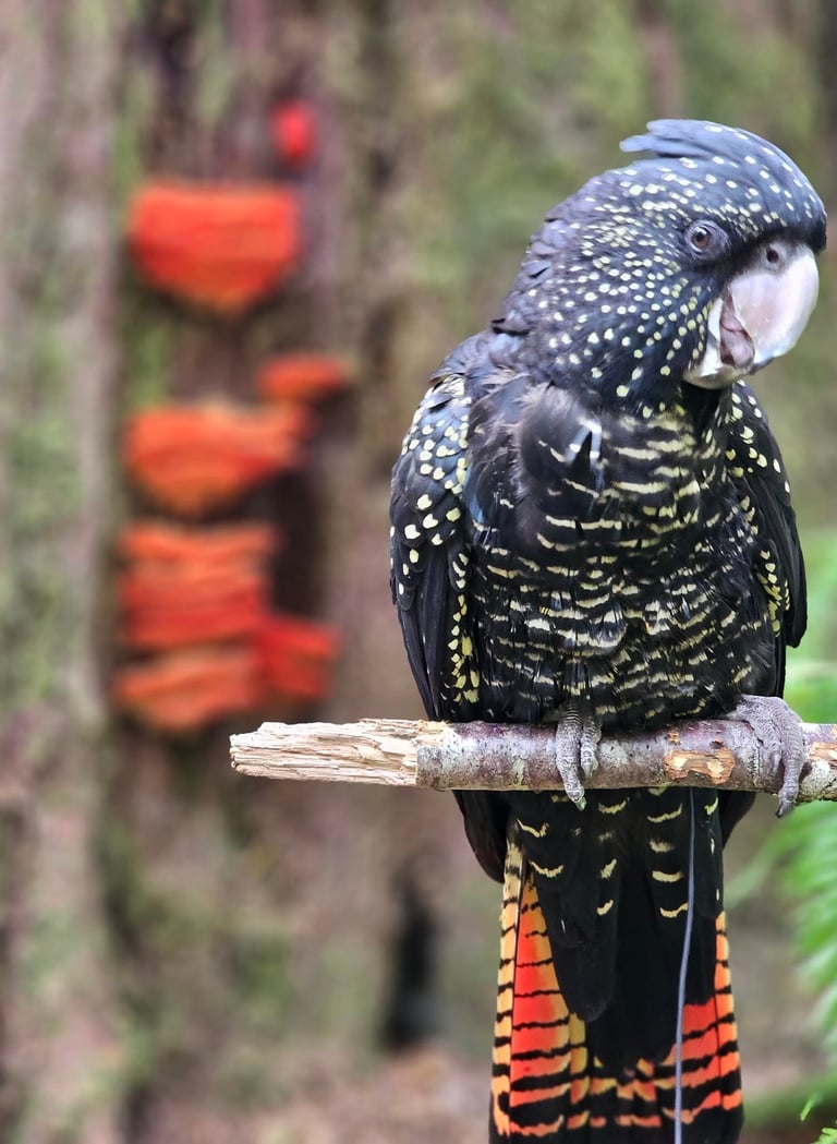 Both male & female Red-Tail Black Cockatoo juveniles have the spots and “flame” style tail that you see on Horus, it is not until adolescence that the males loose the spots and get a solid red tail.