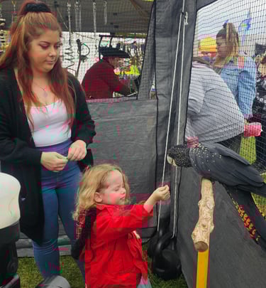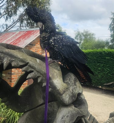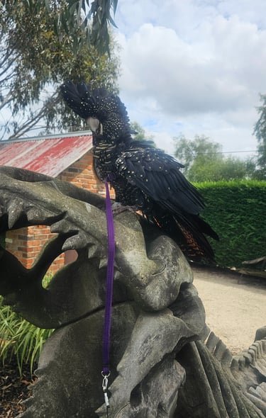 Horus was hatched / raised with a calcium deficiency and due to this her mental development and physical strength were affected. She is a happy bird but does take longer to learn and grasp concepts than the other birds in the flock. Horus is harness trained and has enjoyed going out and about with Melissa & Nathan for most of her life. She can recall & target but only when SHE is in the mood for it.